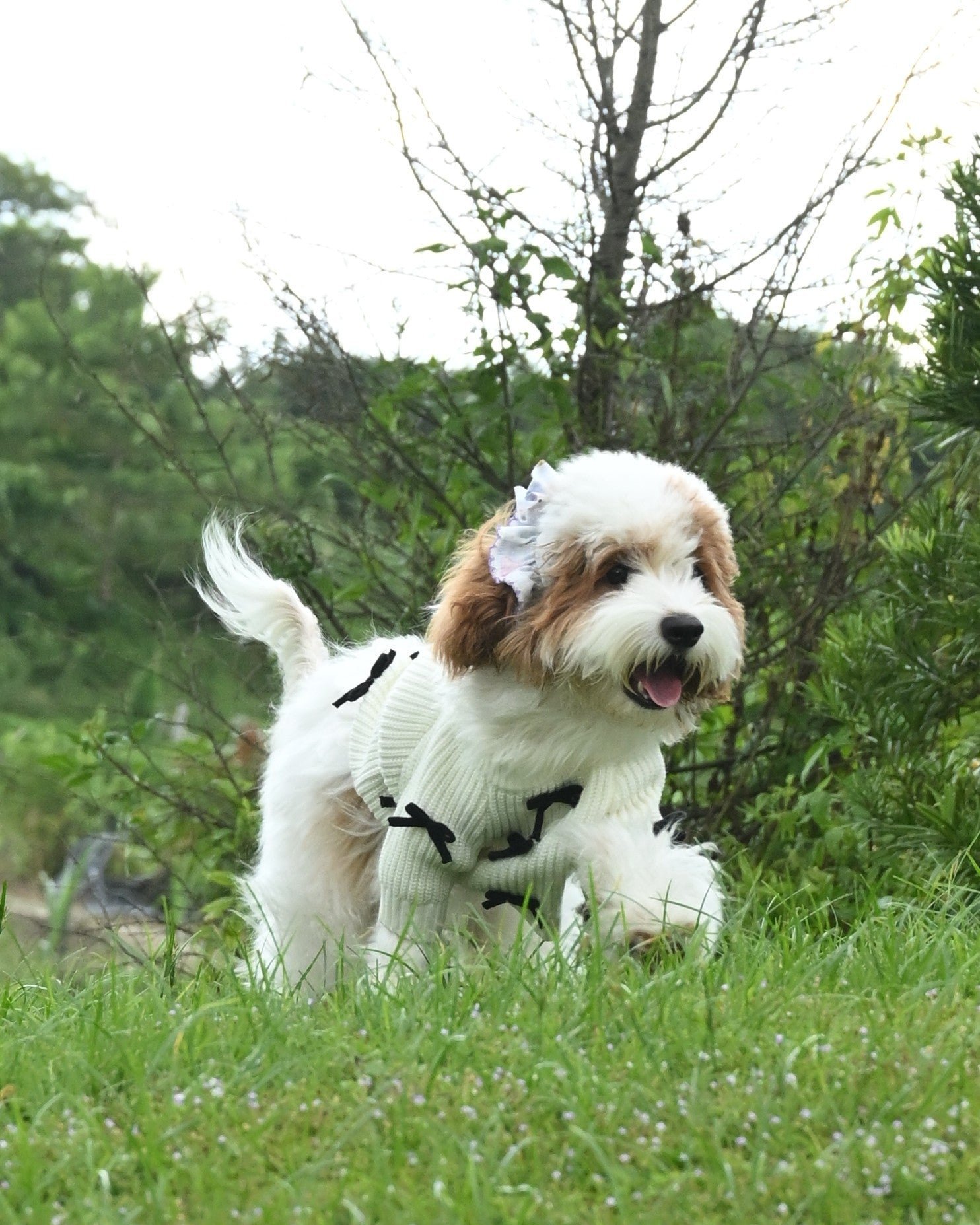 Elegant 3D Bow Detailing: The cute black bow accents scattered across the sweater add a fun yet refined touch to your pet’s outfit.